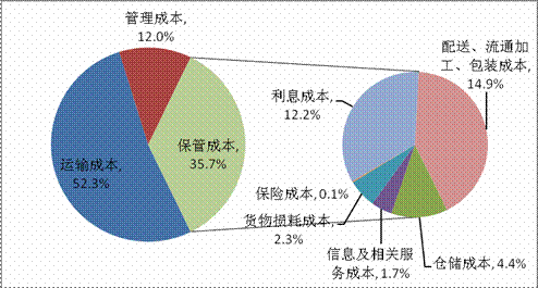 近年來在鋼鐵價格持續低迷、銀行限貸等諸多因素影響下,鋼鐵企業為壓縮物流環節費用,積極采取措施,如加大直供比例及電子商務平臺的應用,以實現供應鏈的成本節省和快速響應。2013年鋼鐵行業庫存率為11.0%,近年總體呈下降趨勢,較2009年下降了1.6個百分點。在此背景下,倉儲成本和利息成本占比分別下降0.01和0.2個百分點,占4.4%和12.2%。