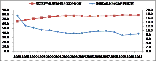 圖1:美國產(chǎn)業(yè)結(jié)構(gòu)變化與物流成本的走勢(shì)變化 單位:%