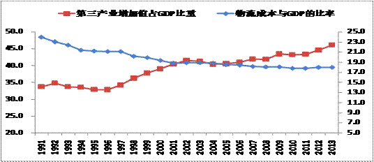 根據(jù)美國的歷史數(shù)據(jù)進(jìn)行分析表明,在美國,第三產(chǎn)業(yè)增加值占GDP的比重每上升1個(gè)百分點(diǎn),物流成本與GDP的比率下降約0.6個(gè)百分點(diǎn)。