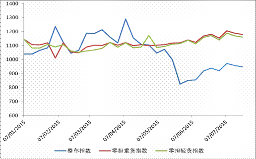 從分車型指數看,各車型指數環比均有小幅回落。整車指數為948.9點,比上周回落0.9%,比年初回落7.5%,但比5月末回升15.1%;零擔輕貨為1161.5點,比上周回落0.68%,比年初回升5.0%,比5月末回升4.3%;零擔重貨為1179.6點,比上周回落0.72%,比年初回升6.2%,比5月末回升5.4%。