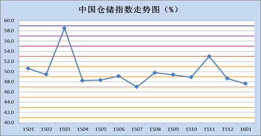 中國物流與采購聯合會與中儲發展股份有限公司聯合調查的2016年1月中國倉儲指數為47.7%,較上月回落1.0個百分點。各分項指數中,除業務活動預期指數、平均庫存周轉次數指數、延伸業務量指數出現回升外,其余指數均有不同程度的回落。