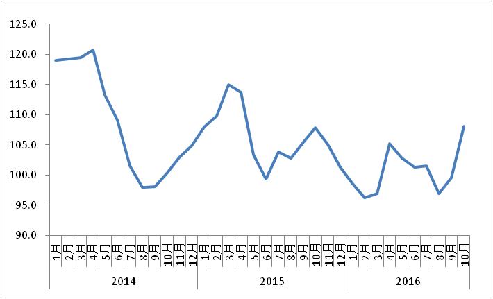 由中國物流與采購聯合會和林安物流集團聯合調查的中國公路物流運價指數2016年10月為108.1點,比上月回升8.7%,回升幅度為年內的最高。運價指數連續兩個月環比回升,且回升幅度比上年同期擴大5個百分點。這也顯示出,本月運價指數的回升一方面是受到公路物流市場傳統旺季來臨,“雙十一”將近備貨需求明顯回升等因素影響;另一方面,也是受到治超新政推進、市場運力結構調整等因素影響,運輸費用水平有所上漲,帶動價格指數回升。從各周情況看,月內各周均有所回升,各周呈現“連續性上漲,幅度有所回調”的態勢。
