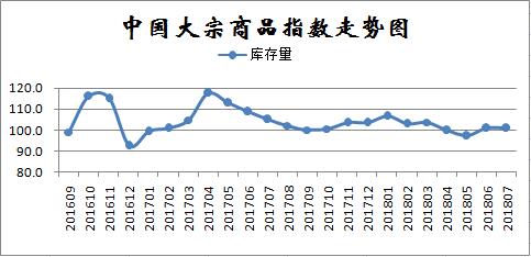 2018年7月份,大宗商品庫存指數止跌回升至101.0%,連續兩個月回升,顯示商品庫存持續增加,市場供大于求的態勢未有明顯改觀。各主要商品中,鋼鐵庫存繼續下降,成品油和汽車庫存由升轉降,有色金屬和化工庫存繼續增加,但增速減緩,原煤庫存增速加快,鐵礦石庫存止跌反彈。
