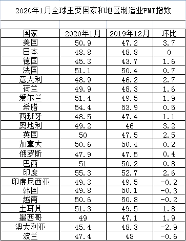 2020年1月全球主要國家制造業PMI