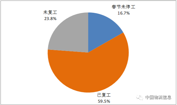 在調查的企業中,7家春節期間未停工停產,占比為16.7%;25家已于2月19日前復工,占比為59.5%;10家目前仍未復工,占比為23.8%。整體來看,目前倉儲行業復工率已經達到七成以上,企業在做好疫情防控工作的同時,積極落實各項措施,有序復工復產,全力以赴確保生產經營穩定運行。