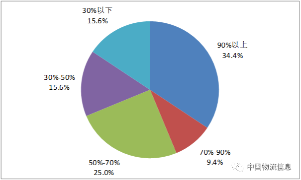 已復工企業倉庫利用率水平下降不大,總體情況較好,九成以上企業達到去年同期水平的50%以上。其中,34.4%的已復工企業反映與去年同期相比變化不大;34.4%的已復工企業反映達到去年同期水平的70%-90%;21.9%的已復工企業反映達到去年同期水平的50%-70%,3.1%的已復工企業反映達到去年同期水平的30%-50%,6.3%的已復工企業反映在去年同期水平30%以下。倉庫利用率情況較好的省市主要有廣東、天津、河北、上海、山東、山西、四川,其中廣東省的企業反映目前由于下游企業需求停滯,出庫量明顯少于進庫量,庫存水平上升,個別倉庫處于爆倉狀態。
