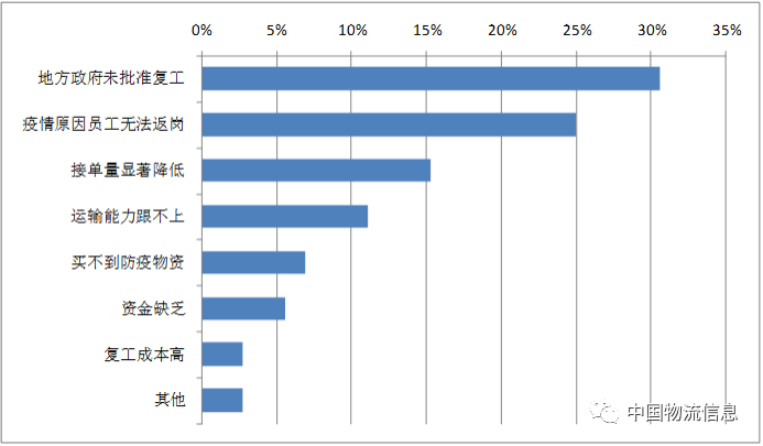 一是地方政府沒有批準復工,占比最高,達到30.6%;二是疫情擴散員工無法按時返崗,占比為25.0%;三是市場需求不足,接單量顯著下降,占比為15.3%。此外,反映運輸能力跟不上和買不到防疫物資的企業也較多,占比分別為11.1%和6.9%。