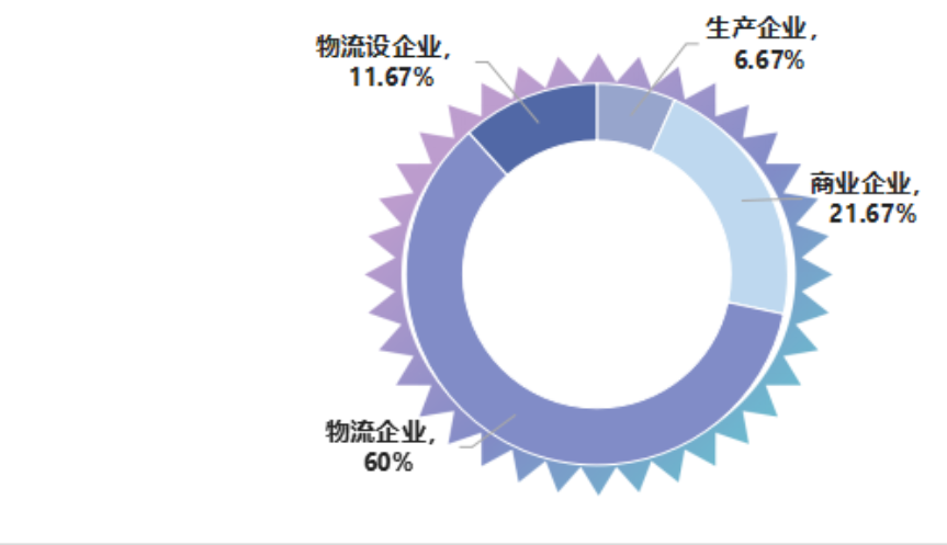 此次調研中,生產企業有8家,占比6.67%;商業企業26家,占比21.67%;物流企業72家,占比為60%;物流設備企業14家,占比為11.67%。