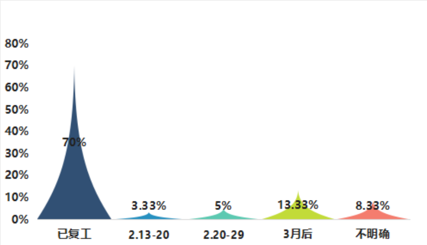 調研結果顯示,70%的企業已于2月13日之前復工;8%左右的企業在二月中下旬復工;13.33%的企業預計3月份以后復工;除此之外,還有少部分地區沒有明確復工時間。