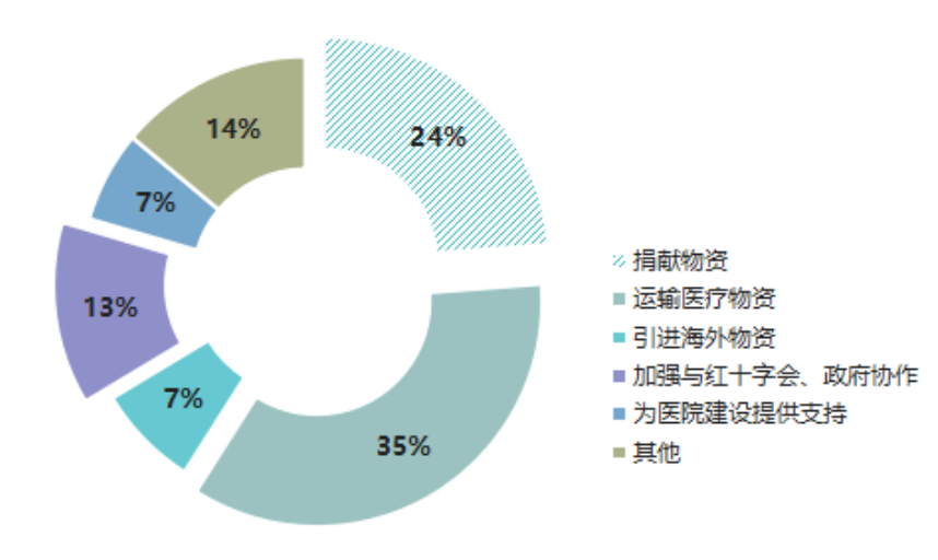 從調研結果整體來看,開展捐獻物資、運輸醫療物資的企業占將近60%,14%的企業通過企業資源,引進海外物資;13%的企業加強與紅十字會、政府協作,承擔相應的工作;7%的企業積極參與到火神山、雷神山、方艙醫院建設當中。