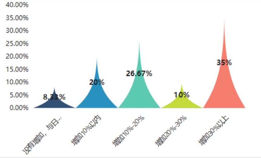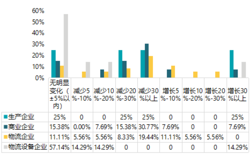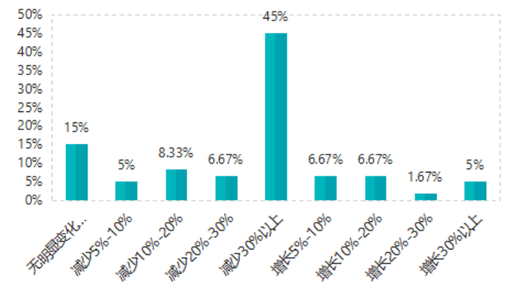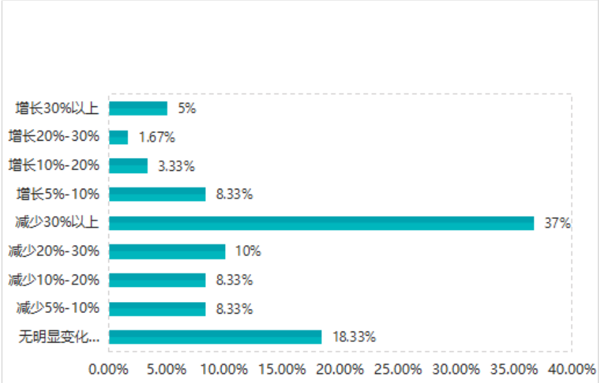 從調研結果整體來看,受疫情影響,大部分企業業務量存在不同程度的下降,將近一半的企業業務量減少30%以上。也有少部分企業業務量呈現不同程度的增加。此外,有18.33%的企業業務量無明顯變化。