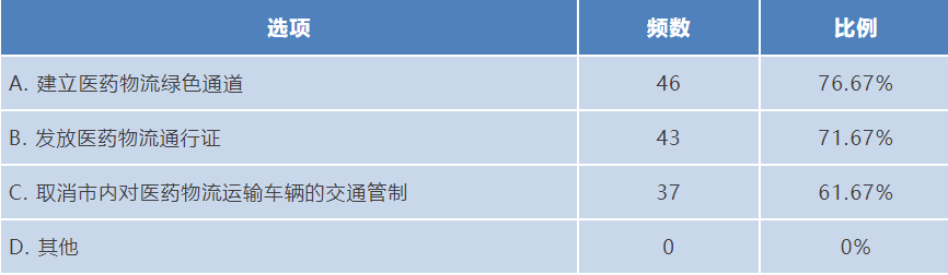 得益于交通運輸部出臺的緊急政策,抗疫醫療物資基本順暢到達抗疫一線。超過70%的企業認為疫情過后,綠色通道、通行證等這些政策可以常規化,提高醫藥物流效率,保證醫藥物資的可及性、及時性、安全性等。