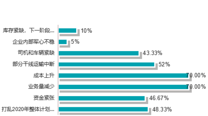 調研結果顯示,受疫情影響,70%的企業承受業務量減少、成本上升的壓力;40%的企業面臨資金緊張、司機和車輛緊缺的困境;52%的企業部分干線運輸終端。疫情無情人有情,企業內部軍心穩定值得欣慰。