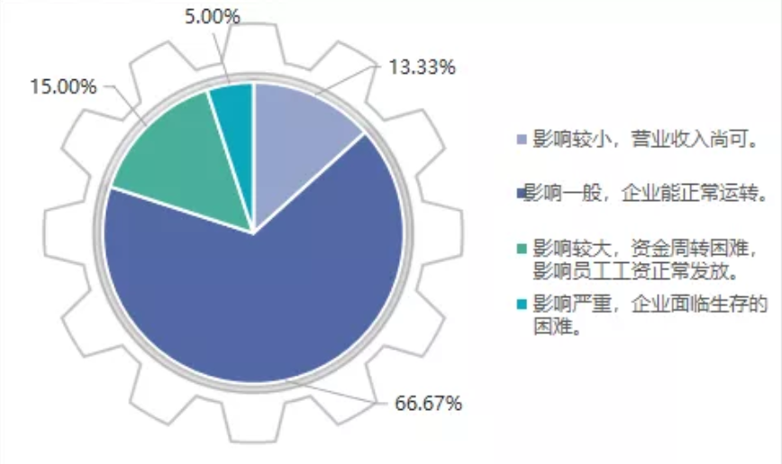 整體來看,疫情對企業上半年經營影響不用過于悲觀。66.67%的企業表示影響一般,企業能正常運轉;15%的企業表示影響較大,資金周轉困難;但是5%的企業表示影響比較嚴重,很有可能面臨生存的困難。