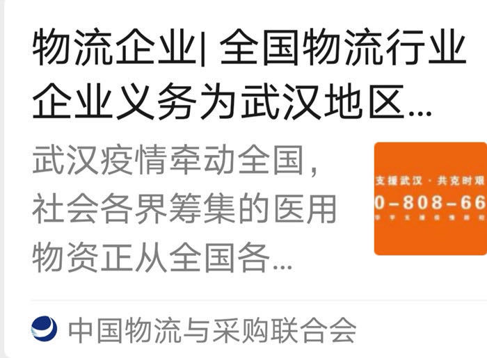 中國物流與采購聯(lián)合會、全國物流行業(yè)、物流企業(yè)、物流人,給武漢、湖北人民無疆大愛,給抗疫主戰(zhàn)場武漢、湖北物流行業(yè)關心支持。