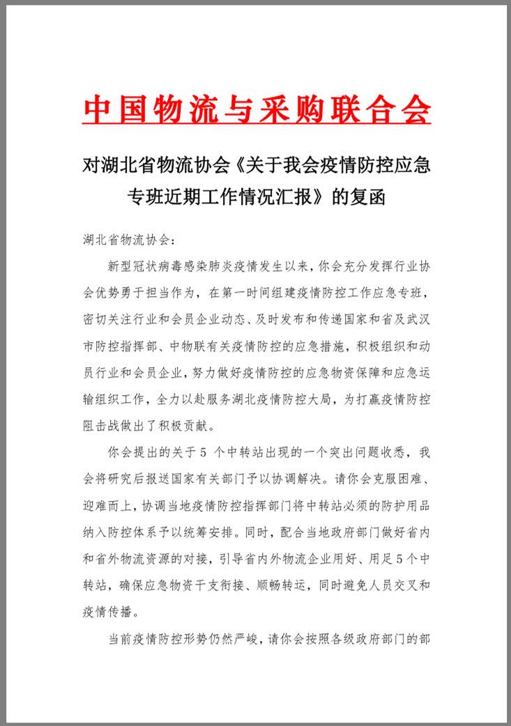 2月7日,中國物流與采購聯(lián)合會以《對湖北省物流協(xié)會<關于我會疫情防控應急專班近期工作情況匯報>的復函》書面回復,激勵湖北省物流協(xié)會充分發(fā)揮行業(yè)協(xié)會優(yōu)勢,勇于擔當作為,全力以赴服務湖北疫情防控大局,為打贏疫情防控阻擊戰(zhàn)積極貢獻行業(yè)力量。