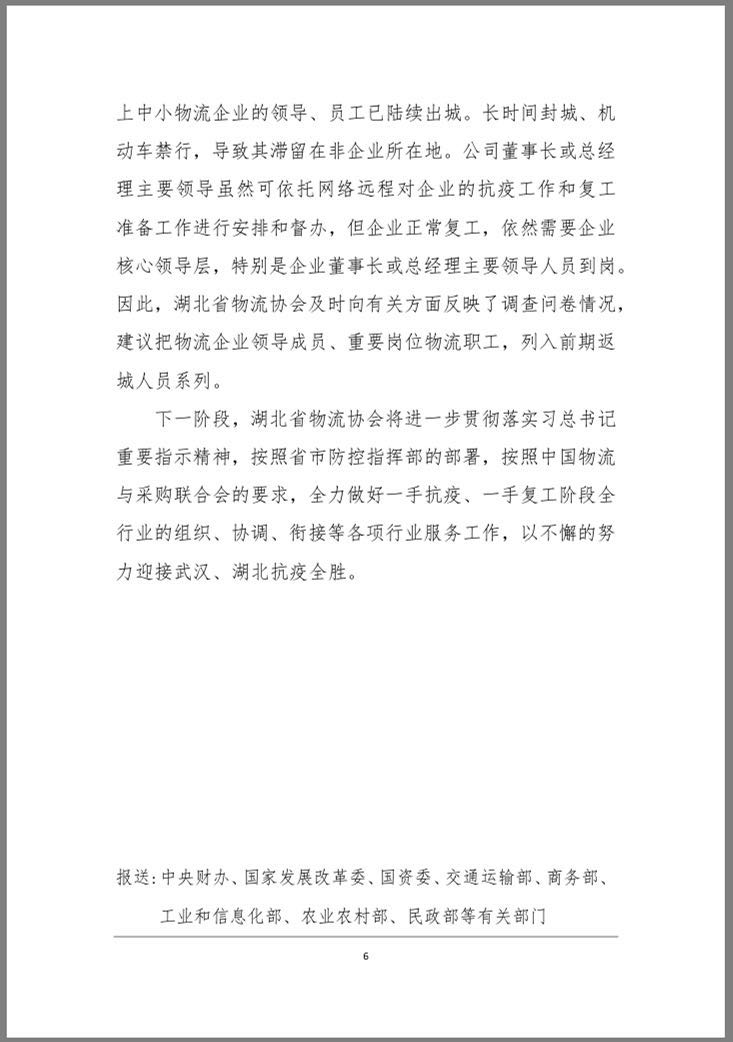 ★ 3月3日,在武漢、湖北抗疫進入最吃勁階段,湖北省物流協(xié)會以鄂物協(xié)字〔2020〕6號文,將武漢“封城”40天來全省物流行業(yè)抗疫保供、復工復產(chǎn)中的主要作法、突出成效、具體問題,向中國物流與采購聯(lián)合會上報了《關于我會一個多月來抗疫保供行業(yè)服務工作情況匯報》。