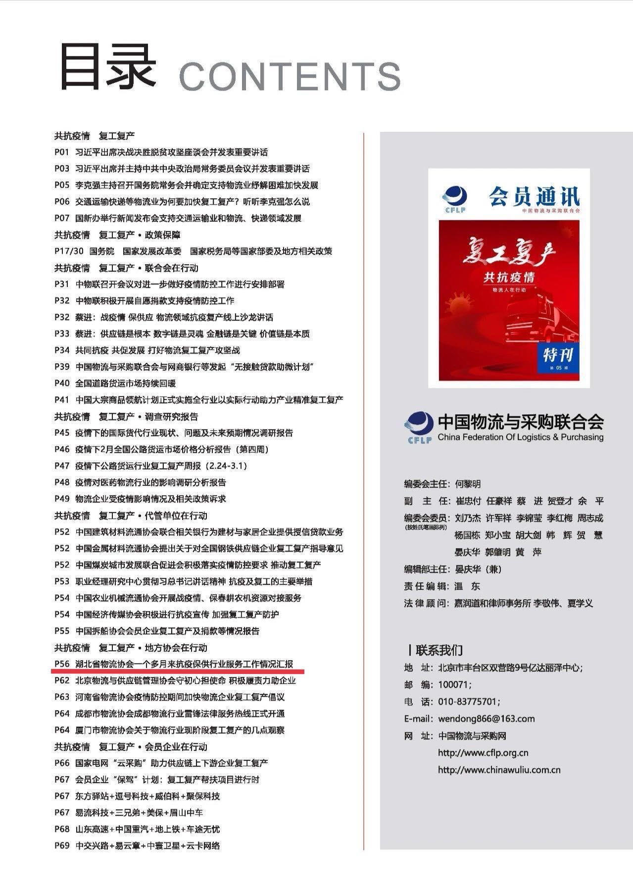 中國物流與采購聯(lián)合會2020年《會員通訊》第5期,在“共抗疫情、復工復產(chǎn)地方協(xié)會在行動”欄目P56,全文刊發(fā)《湖北省物流協(xié)會一個多月來抗疫保供行業(yè)服務工作情況匯報》。