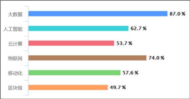 業(yè)務(wù)場景和企業(yè)內(nèi)在和外在需求是數(shù)字化技術(shù)選擇的依據(jù)。隨著我國已經(jīng)進入現(xiàn)代供應(yīng)鏈的新時代,供應(yīng)鏈、產(chǎn)業(yè)鏈、價值鏈正在深度融合,企業(yè)的業(yè)務(wù)場景和需求不再是單一的,已經(jīng)形成多領(lǐng)域、多產(chǎn)業(yè)交織的局面,因此,數(shù)字化技術(shù)的應(yīng)用會有多種組合,常見的數(shù)字化技術(shù)包括:云計算、大數(shù)據(jù)、人工智能、移動化、物聯(lián)網(wǎng)、區(qū)塊鏈。調(diào)查顯示,大數(shù)據(jù)的應(yīng)用是眾多企業(yè)關(guān)注度最高的技術(shù),達到 87%。其次為物聯(lián)網(wǎng)74%。(見圖 3)