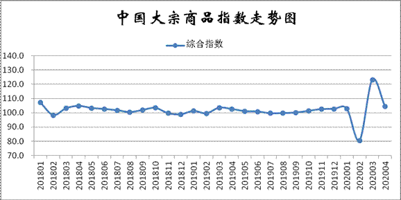 由中國物流與采購聯合會調查、發布的2020年4月份中國大宗商品指數(CBMI)為104.4%,較上月大幅回落18.7個百分點,但仍是2018年5月份以來的次高點。各分項指數中,供應指數、銷售指數和庫存指數全部回落。從本月指數的變化情況來看,在疫情得到有效控制和國家復工復產各項保障措施的強力推動下,國內大宗商品市場供需兩旺,雖供給和需求增速出現回落,但仍處較高水平,商品庫存有所回落,供應壓力得到緩解,顯示大宗商品市場回暖向好的態勢繼續保持,后期商品價格有望得到提振,或整體上揚。