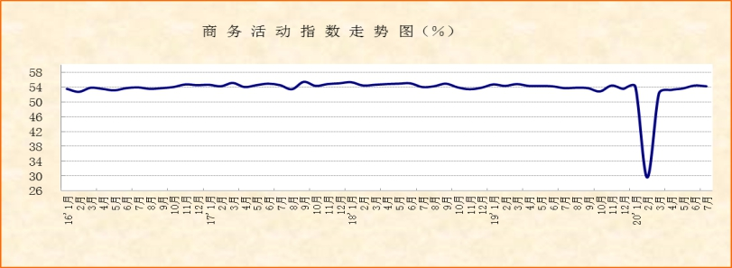 中國物流與采購聯(lián)合會(huì)、國家統(tǒng)計(jì)局服務(wù)業(yè)調(diào)查中心發(fā)布的2020年7月份中國非制造業(yè)商務(wù)活動(dòng)指數(shù)雖較上月小幅回落0.2個(gè)百分點(diǎn),但仍保持在54.2%,連續(xù)2個(gè)月穩(wěn)定在54%以上,較去年同期小幅上升0.5個(gè)百分點(diǎn)。指數(shù)變化顯示,伴隨著疫情對(duì)國內(nèi)經(jīng)濟(jì)影響的逐步減弱,非制造業(yè)在持續(xù)快速恢復(fù)的基礎(chǔ)上,繼續(xù)保持平穩(wěn)較快增長。