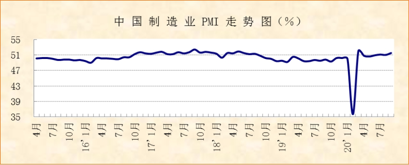 中國物流與采購聯合會、國家統計局服務業調查中心發布的2020年9月份中國制造業采購經理指數(PMI)為51.5%,較上月上升0.5個百分點,連續7個月運行在50%以上。三季度均值為51.2%,較二季度均值上升0.4個百分點,表明經濟復蘇勢頭增強。分項指數變化顯示,供求均衡進一步強化,對外貿易持續改善,大中小型企業協同共進,產業結構不斷優化,就業形勢向好發展。綜合來看,經濟整體運行穩中向好。