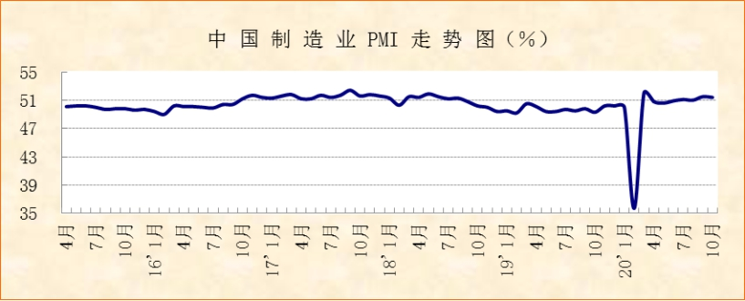 中國物流與采購聯合會、國家統計局服務業(yè)調查中心發(fā)布的2020年10月份中國制造業(yè)采購經理指數(PMI)為51.4%,較上月小幅下降0.1個百分點,連續(xù)4個月運行在51%及以上,經濟繼續(xù)保持穩(wěn)定復蘇態(tài)勢。分項指數變化顯示,市場需求增長態(tài)勢較為穩(wěn)定,企業(yè)生產活動保持平穩(wěn),進出口繼續(xù)改善,高端制造業(yè)持續(xù)快速增長。當前值得關注的問題是原材料購進價格過快上漲以及消費品需求增速短期放緩。