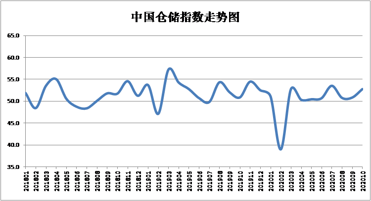 中國物流與采購聯合會和中儲發展股份有限公司聯合調查的中國倉儲指數,2020年10月份為52.8%,較上月上升2.0個百分點,連續八個月保持在榮枯線以上,本月達到三個月以來的高點,新訂單、業務利潤、期末庫存及企業員工等主要分項指數均有不同程度上升,反映出倉儲行業保持平穩向好發展態勢。從分項指數變化情況來看,有以下幾個特點: