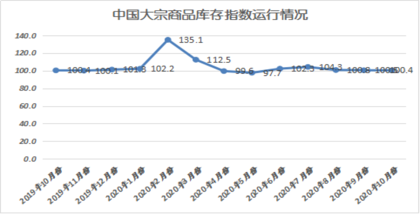 由中國物流與采購聯合會調查、發布的2020年10月份中國大宗商品指數(CBMI)為103.3%,較上月上升1.0個百分點。各分項指數中,供應指數止跌反彈、銷售指數繼續上升,庫存指數仍在下跌。從指數的變化情況來看,本月指數止跌反彈,且供需雙側聯動上升,供需兩旺,特別是需求旺季持續發力,消費端增速快于供應端,市場運行穩中向好,整體表現符合預期。