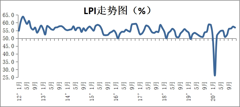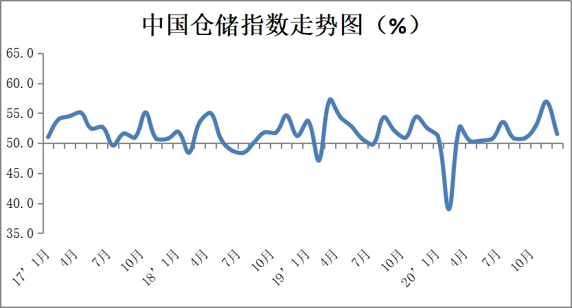 中國物流與采購聯合會發布的2020年12月份中國物流業景氣指數為56.9%較上月回落0.6個百分點;中國倉儲指數為51.5%,較上月回落5.4個百分點。