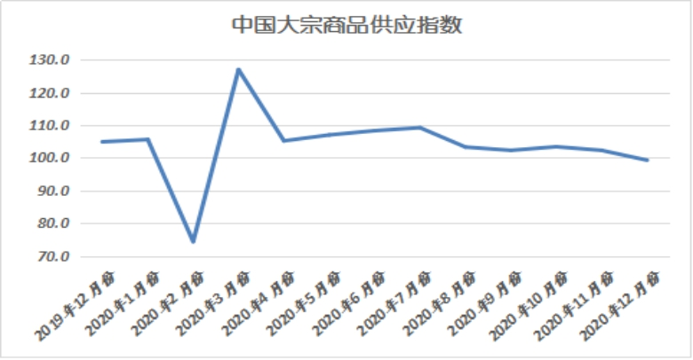 2020年12月份,大宗商品供應指數為99.3%,指數兩連跌至近十個月以來的低點。數據顯示,12月份以來,在生產企業利潤收窄以及各地環保限產趨嚴的作用下,部分商品產量明顯減少,市場供應開始下降。從各主要商品情況來看,鋼鐵、鐵礦石、煤炭和成品油供應量繼續減少,有色金屬、化工和汽車供應量繼續增加,且增速均有所擴大。