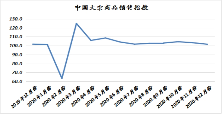 2020年12月份,大宗商品銷售指數為101.6%,較上月回落1.7個百分點,銷售增速持續減緩。從指數的變化情況來看,12月份以來,由于天氣逐漸轉冷,國內終端需求穩步回落,但隨著國民經濟持續穩定恢復,促進消費政策不斷發力,制造業持續復蘇,大宗商品需求表現依然超出預期。各主要商品中,本月除鋼鐵和鐵礦石銷售量有所減少外,其余品種均呈現增加態勢,特別是有色金屬、化工和汽車銷售量增速出現加快的格局。