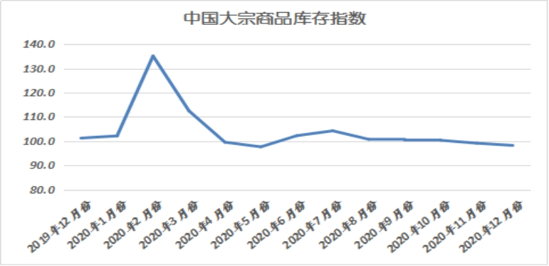 2020年12月份,大宗商品庫存指數為98.3%,較上月下降0.9個百分點,顯示隨著供應量下降以及商品需求整體超預期,商品“去庫存化”得到延續,商品庫存壓力持續緩解。各主要商品中,鋼鐵、鐵礦石、原煤和成品油庫存量繼續下降,有色金屬庫存量開始減少,化工和汽車庫存量則繼續增加,但增速均有所減緩。