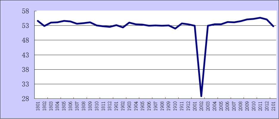 2021年1月份綜合PMI產(chǎn)出指數(shù)為52.8%