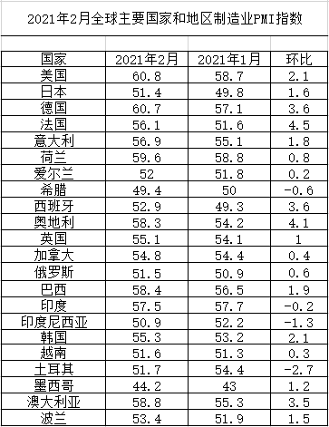 2021年2月全球主要國家制造業PMI