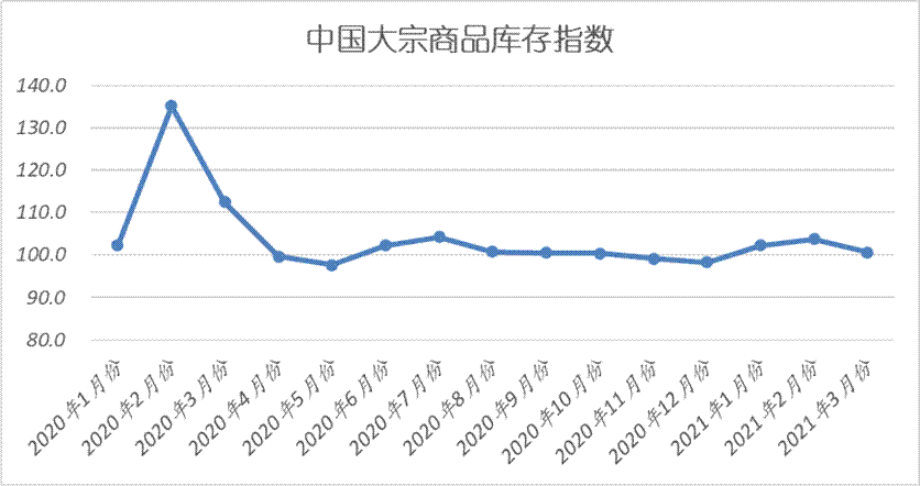 2021年3月份,大宗商品銷售量指數止跌反彈至103.6%,為近五個月以內的最高點,顯示隨著天氣逐漸回升,國內基建投資力度放大,市場終端需求開始集中釋放,商品成交量明顯增加。各主要商品中,鋼鐵、煤炭、成品油和汽車銷售量止跌反彈,且升幅明顯,有色金屬和化工銷售量繼續增長,且增速均有所加快,鐵礦石銷售量受鋼廠限產影響,增速有所減緩。