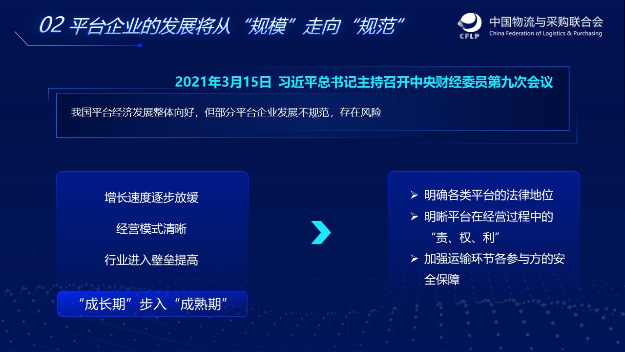 3月15日,習(xí)近平總書(shū)記主持召開(kāi)中央財(cái)經(jīng)委員會(huì)第九次會(huì)議,會(huì)議指出我國(guó)平臺(tái)經(jīng)濟(jì)發(fā)展整體向好,但部分平臺(tái)企業(yè)發(fā)展不規(guī)范,存在風(fēng)險(xiǎn)。網(wǎng)絡(luò)貨運(yùn)企業(yè)的盲目擴(kuò)張期已經(jīng)結(jié)束,從行業(yè)發(fā)展的生命周期來(lái)看,網(wǎng)絡(luò)貨運(yùn)業(yè)態(tài)的發(fā)展已從“成長(zhǎng)期”逐步步入“成熟期”,業(yè)務(wù)規(guī)模的增長(zhǎng)速度逐步放緩,主要經(jīng)營(yíng)模式清晰,行業(yè)進(jìn)入壁壘提高,企業(yè)競(jìng)爭(zhēng)日漸激烈。在此背景下,規(guī)范經(jīng)營(yíng)秩序、消除惡性競(jìng)爭(zhēng),是行業(yè)發(fā)展應(yīng)重點(diǎn)關(guān)注的問(wèn)題。明確各類平臺(tái)的法律地位,明晰平臺(tái)在經(jīng)營(yíng)過(guò)程中的“責(zé)、權(quán)、利”,加強(qiáng)運(yùn)輸環(huán)節(jié)各參與方的安全保障,為行業(yè)發(fā)展?fàn)I造一個(gè)健康、規(guī)范、可持續(xù)發(fā)展的環(huán)境是未來(lái)關(guān)注的重點(diǎn)。