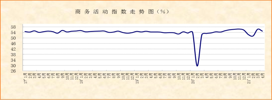 中國物流與采購聯合會、國家統計局服務業調查中心發布的2021年4月份中國非制造業商務活動指數雖較上月回落1.4個百分點,但仍保持在54.9%的較高水平,且較去年同期上升1.7個百分點。我國經濟在經歷了一季度的快速回升后,回歸平穩恢復趨勢,經濟恢復基本面良好。