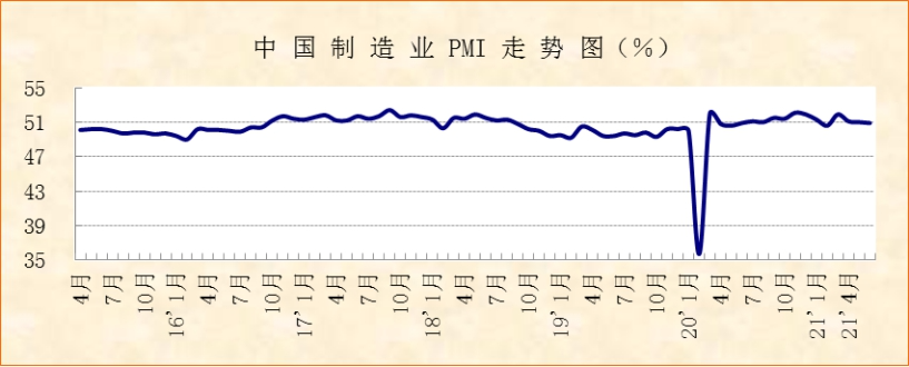 中國物流與采購聯合會、國家統計局服務業調查中心發布的2021年6月份中國制造業采購經理指數(PMI)為50.9%,較上月小幅下降0.1個百分點,連續3個月保持在51%左右,經濟繼續保持穩定恢復態勢。分項指數顯示,6月最突出的變化是原材料價格漲勢減緩,有利于穩定市場需求。就業人數穩中有增,消費品行業平穩較快恢復。但市場需求仍需鞏固,企業利潤空間將繼續承壓一段時期。