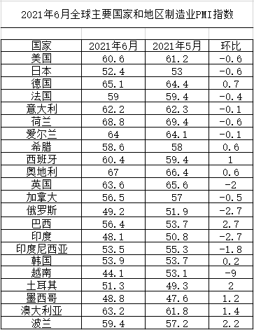 2021年6月份全球主要國家制造業PMI