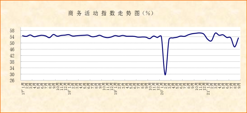 中國物流與采購聯(lián)合會、國家統(tǒng)計局服務(wù)業(yè)調(diào)查中心發(fā)布的2021年9月份中國非制造業(yè)商務(wù)活動指數(shù)較上月回升5.7個百分點至53.2%;新訂單指數(shù)較上月回升6.8個百分點至49.0%,伴隨著疫情影響的減弱,非制造業(yè)供需活動較上月有明顯恢復(fù),但與去年同期相比,上述兩個指數(shù)均有不同程度回落,顯示非制造業(yè)恢復(fù)力度仍有待加強。供需的明顯恢復(fù)帶動終端銷售價格和就業(yè)活動有所回穩(wěn)。銷售價格指數(shù)較上月回升1.2個百分點至50.5%;從業(yè)人員指數(shù)較上月回升0.8個百分點至47.8%。