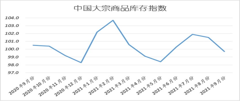2021年9月份,大宗商品庫存指數(shù)較上月回落1.8%,跌至近四個月以來的最低,商品庫存量時隔三個月后再現(xiàn)下降格局,表明隨著供給端持續(xù)下降,消費(fèi)端旺季回暖,市場供需銜接順暢,供求關(guān)系有所改善,商品庫存開始減少,市場庫存壓力有所緩解。各主要商品中,鋼鐵、原煤、有色金屬和汽車庫存量均較上月有所減少,鐵礦石、成品油和化工庫存量雖有增加,但增速較上月均有減緩。
