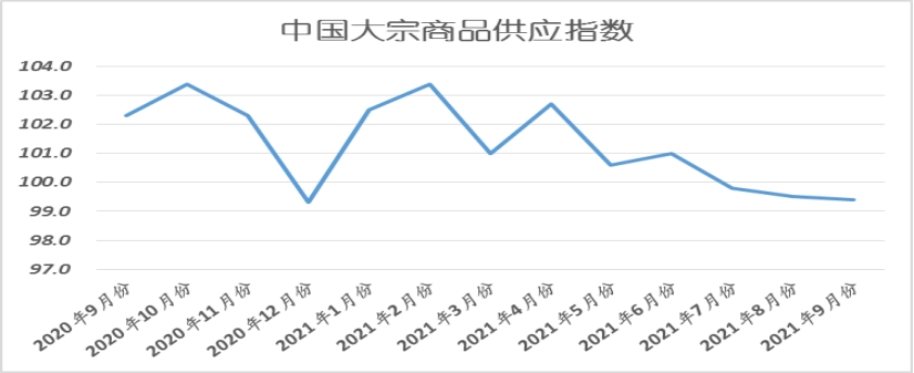 2021年9月份,大宗商品供應(yīng)指數(shù)為99.4%,較上月回落0.1個百分點(diǎn),指數(shù)三連降至近九個月以來的最低點(diǎn),顯示供給端在政策干預(yù)下,呈現(xiàn)持續(xù)下降的態(tài)勢,特別是“拉閘限電”對“雙高”行業(yè)的供應(yīng)影響明顯。2021年8月下旬以來,已經(jīng)有20個省、自治區(qū)和直轄市出臺了力度不等的停電、限電措施。目前遼寧、黑龍江、吉林三省已經(jīng)開始對居民用電進(jìn)行限制,其余省份影響的是工業(yè)用電,主要集中在“雙高”產(chǎn)業(yè)或項(xiàng)目,例如鋼鐵、電解鋁、工業(yè)硅、煤化工、紡織印刷和化纖等。從各主要商品情況來看,本月鋼鐵、有色金屬和汽車供應(yīng)量繼續(xù)下降,化工供應(yīng)量重回下降區(qū)間,成品油供應(yīng)量增速減緩,原煤供應(yīng)量增速加快,鐵礦石供應(yīng)量止跌回升。