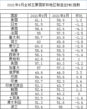 2021年9月份全球主要國家制造業PMI