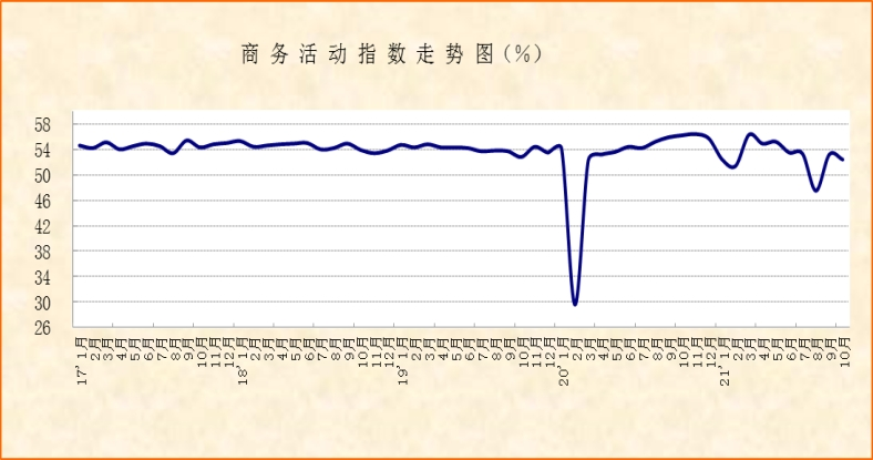 中國物流與采購聯合會、國家統計局服務業調查中心發布的2021年10月份中國非制造業商務活動指數較上月回落0.8個百分點至52.4%;新訂單指數與上月持平,保持在49%,表明非制造業經營活動增速較上月有所放緩,但需求相對穩定。