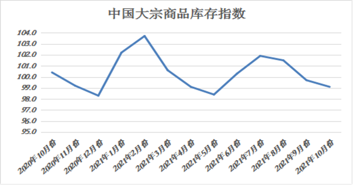 2021年10月份,大宗商品庫存指數為99.1%,指數較上月回落0.6個百分點,為五個月以來的最低,顯示雖市場需求增速減緩,但供應端持續減弱,令商品庫存繼續下降。各主要商品中,鋼鐵、成品油和有色金屬庫存量較上月有所減少,化工庫存量繼續增加,但增速減緩,鐵礦石庫存量增速加快,煤炭和汽車庫存量則止跌回升。