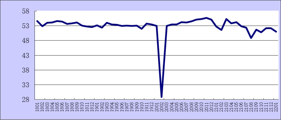 2018年1月-2022年1月綜合PMI產出指數走勢圖
