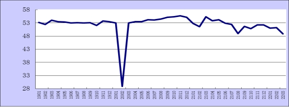 中國物流與采購聯合會、國家統計局服務業調查中心采購經理調查發布的2022年3月份綜合PMI產出指數為48.8%,較上月下降2.4個百分點。該指數是PMI指標體系中反映當期全行業(制造業和非制造業)產出變化情況的綜合指數,由制造業生產指數與非制造業商務活動指數加權求和而成,權數分別為制造業和非制造業占GDP的比重。