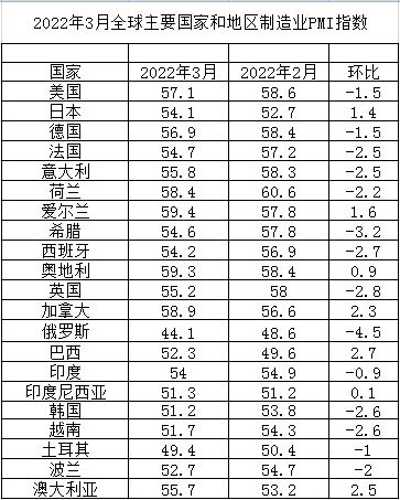 2022年3月全球主要國家制造業PMI