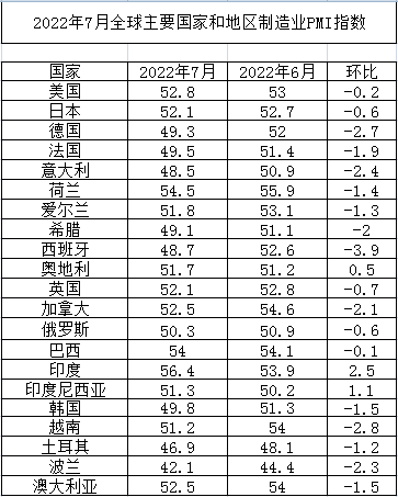 2022年7月全球主要國家制造業PMI